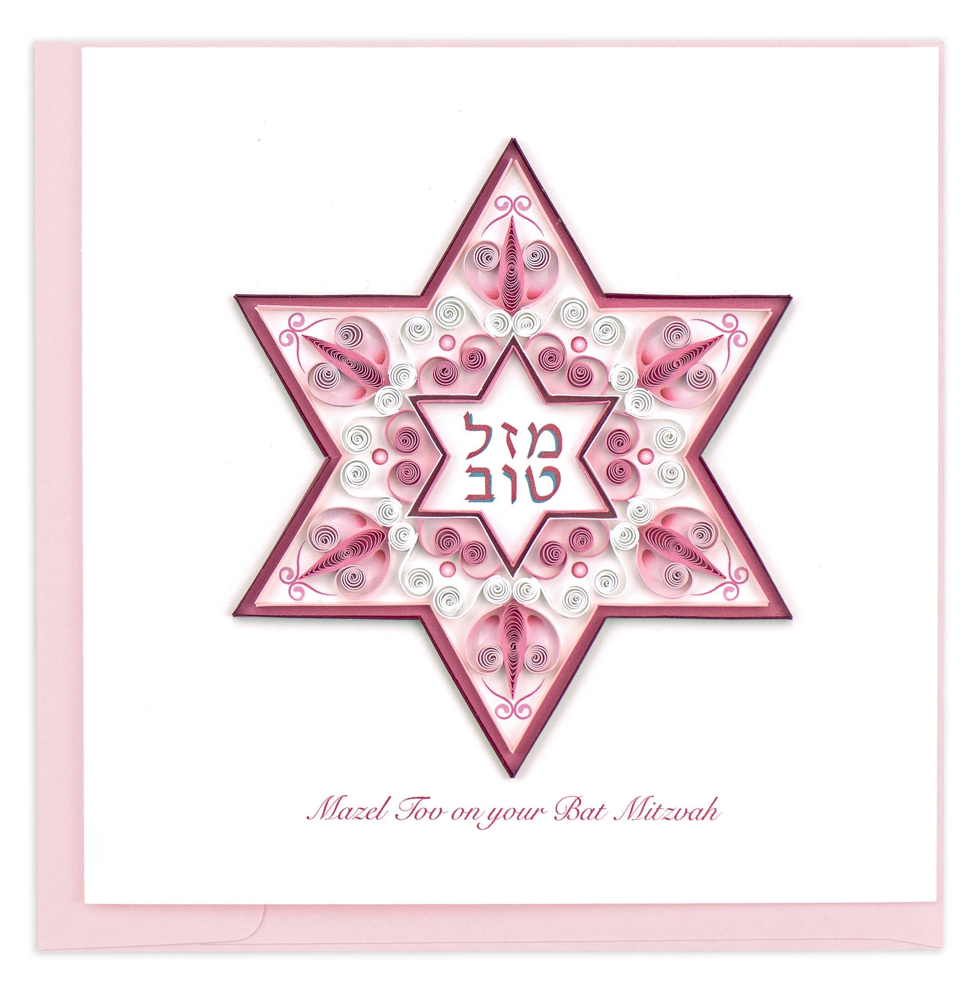 A Bat Mitzvah is a special occasion in a young woman's life, wish her the best with the Bat Mitzvah greeting card. This beautiful quilled card contains a stylized quilled pink and white star of David, with Hebrew letters inside the star that read Mazel Tov in Hebrew. Underneath the card it reads, Mazel tov on your Bat Mitzvah!