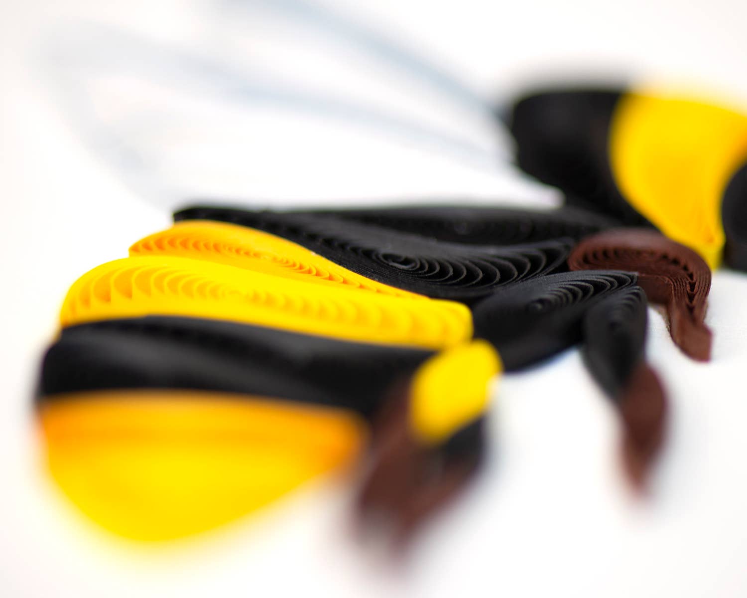 Share the new buzz with a friend in a handcrafted Bumble Bee card! A bumble bee symbolizes community, brightness and personal power. The card design depicts a flying Bumble Bee with black and yellow stripes about to land on a white spring daisy. The perfect card to send in the spring to your queen bee!