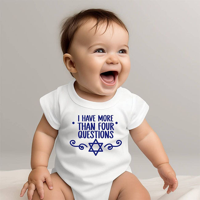 This short-sleeved baby bodysuit reads "I have more than four questions" in a playful print font with a Star of David as shown above. It's soft and cozy and fantastic for your little one to wear for any day of their first Passover