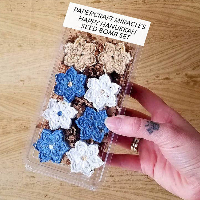 Looking for unique and meaningful hanukkah gifts? Celebrate all eight nights of hanukkah with this adorable gift set of plantable recycled paper seed bombs. Get three blue, three white and two gold star of david shaped seed bomb, one for each night of the holiday. Get a set for each of your loved ones and have fun planting them and sharing pictures of the flowers that grow!