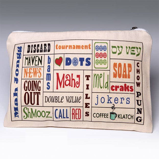 Who doesn't love Mah Jongg? A FUNctional gift, this cotton pouch is just perfect for cosmetics, change, car keys, odds and ends & all your stuff...Small pouch is unlined and measures 7.25" x 5.25". Image is printed on one side. Can be personalized on reverse side. Packaged in a cellophane bag. These pouches are designed and hand-printed in New Jersey.