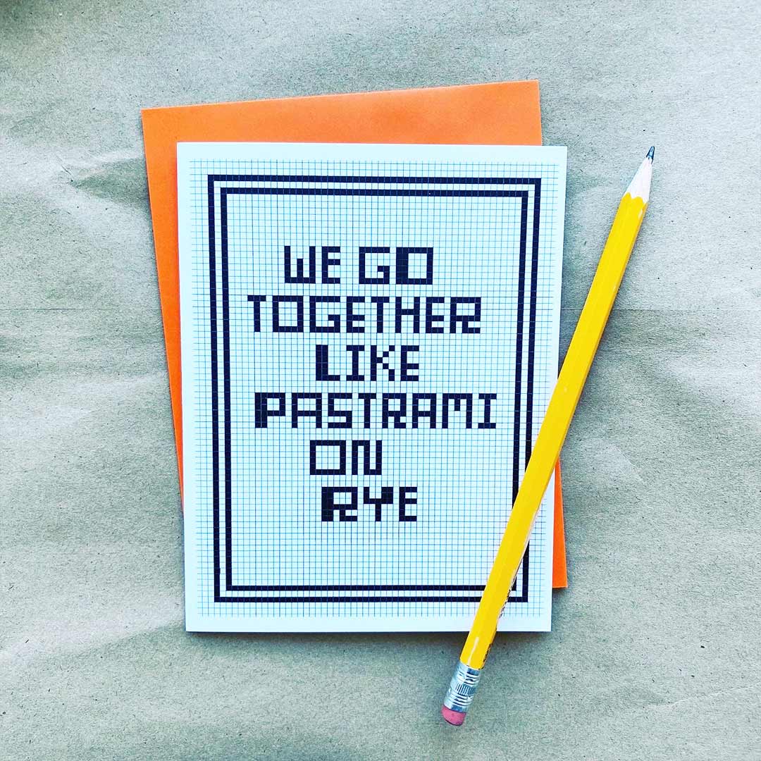 We go together like pastrami on rye! BFFs, BAEs - the perfect card to give your perfect partner. * Size: 4.25 x 5.5 in * Includes: 1 card + 1 envelope * Interior Greeting: Blank * packaged in clear protective sleeve NOTE: color may vary slightly per monitor resolution.