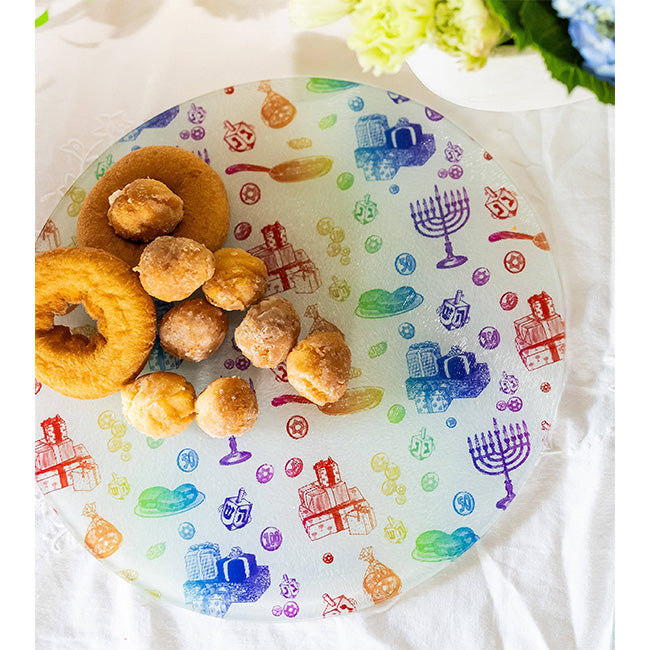 Hanukkah doesn't have to be blue, celebrate in color this year with our Rainbow Hanukkah collection. This 11.8" round tempered glass tray is perfect to display your Hanukkiah on, and catch any wayward wax, or can be used as a serving tray. Makes a wonderful holiday or host gift. Tray comes with 4 rubber feet attached to keep it raised from the table. Not dishwasher or microwave safe, handwash only.