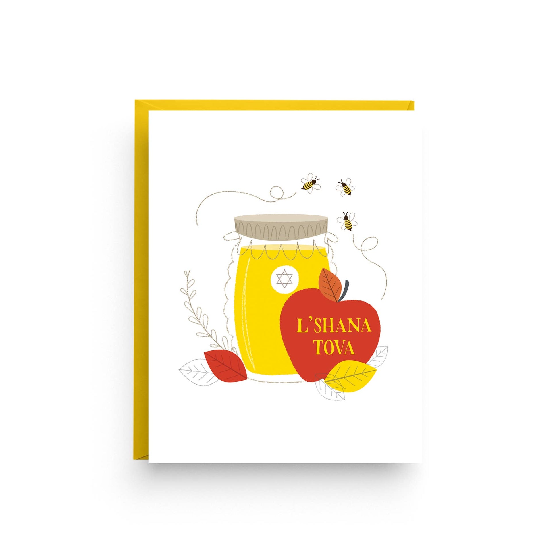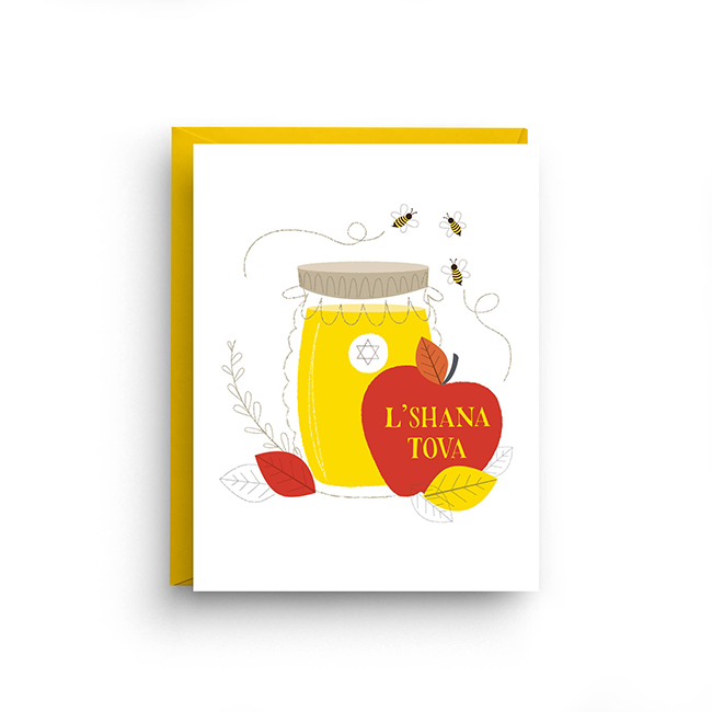 Design: Showcases a lovely honey jar and apple illustration, complemented by "L'Shana Tova" wishes and adorned with festive details.