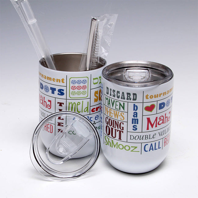 Who doesn't love Mah Jongg? Just the right gift ... not just for wine. New straight sided double-walled insulated tumbler. This 12 oz. stemless stainless steel shatter proof tumbler keeps beverages cold for 9 hours and hot for 4. Comes with a clear lid that can accommodate a straw. Plastic straw, metal straw, and cleaning brush included. Image wraps around tumbler. Dishwasher safe. Packaged in a protective box.